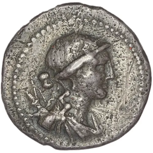 | Descrição do reverso | Eagle standing right with spread wings; to right, caps of Dioscuri; all within laurel wreath. |
