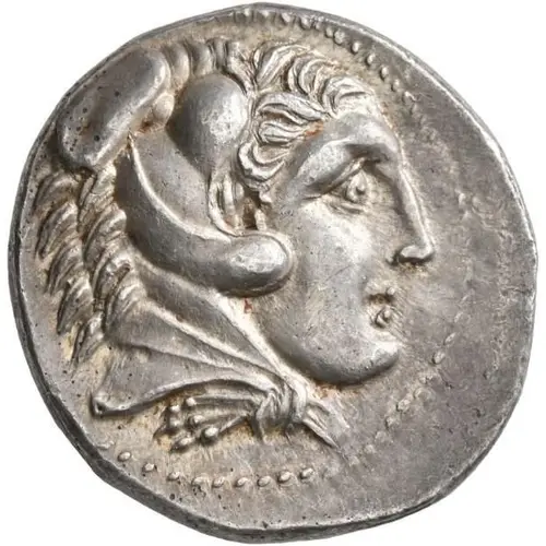 | Mô tả mặt trước | Head of beardless Heracles right wearing lion skin headdress. |