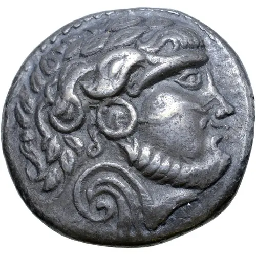| Obverse description | Heavily stylised laureate and bearded head to right with spiral ornament at neck. |