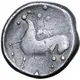 Heavily stylised horse prancing to left; five pellets above; top of cone visible below