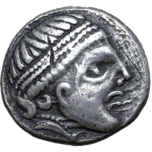Beschrijving voorzijde Celticised, beardless and pearl-diademed head to right.
