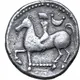 Beschrijving keerzijde Rider on horseback to left; crescent behind, fetter below.