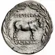 | Mô tả mặt sau | Bull standing to right, head facing and adorned with fillet, city name above, magistrate name in exergue; all within laurel wreath. |
