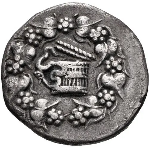 | Obverse description | Cista mystica with serpent. All within ivy wreath |