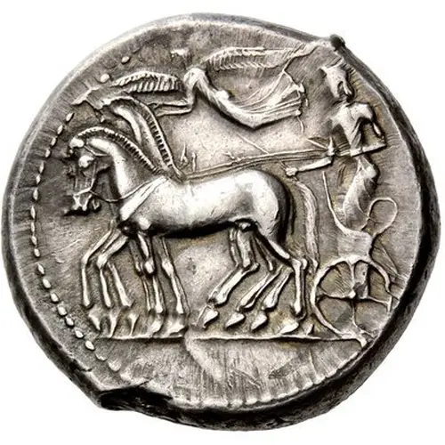 | Obverse description | Bearded charioteer driving quadriga walking to left. Above, Nike flying left to crown the horses |