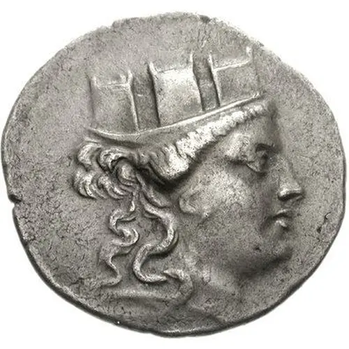 | Mô tả mặt trước | Turreted head of Tyche facing right. |