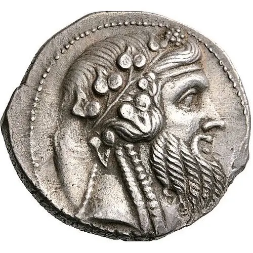 | Mô tả mặt trước | Bearded head of Priapos to right, wearing ivy wreath and with his hair falling in locks to his shoulders |