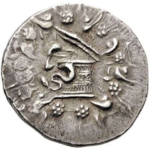 | Obverse description | Basket (cista mystica) from which snake coils. Around, ivy wreath with fruits |