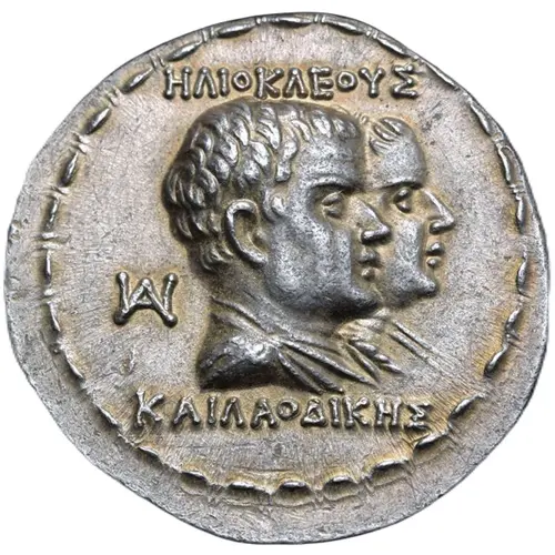 | 表面の説明 | Jugate draped busts of Heliokles and Laodice to right, HΛIOKΛEOYΣ above, KAI ΛAOΔIKHΣ below; monogram behind. |