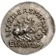 Diademed and draped bust of Eukratides to right, wearing Macedonian helmet adorned with bull’s horn and ear |