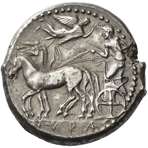 | Arka yüz açıklaması | Diademed head of the nymph Arethusa right, surrounded by four dolphins swimming clockwise. |