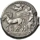 | Ön yüz açıklaması | Slow quadriga driven left by charioteer, holding kentron and reins; above, Nike flying right to crown him; in exergue, ΣVRA. |