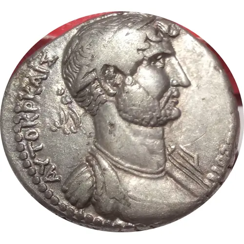 Descrizione del dritto Laureate and cuirassed bust of Hadrian to right with paludamentum [Military Cloak], dotted border
