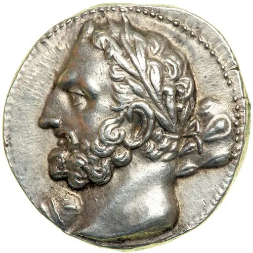 | Описание аверса | Laureate, bearded head left of Herakles-Melqar (?), the strongly Semitic features suggesting Hamilcar Barca (father of Hannibal), with heavy, knotted club over far shoulder. |