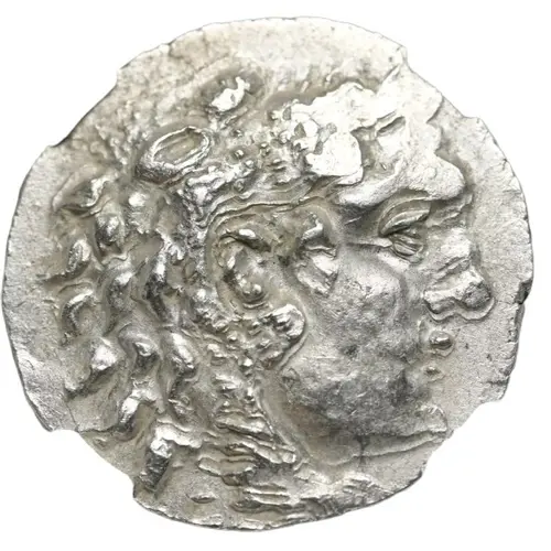 Head of Herakles right, wearing lion skin headdress. |