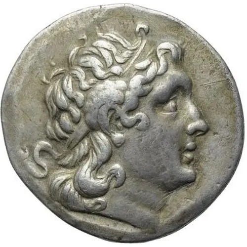 | 裏面の説明 | Athena seated left, holding Nike, crowning the king`s name, in her right hand and leaning with her left arm on shield decorated with lion`s head; behind, transverse spear; monogram in left field, BY below throne and filleted trident in exergue. |