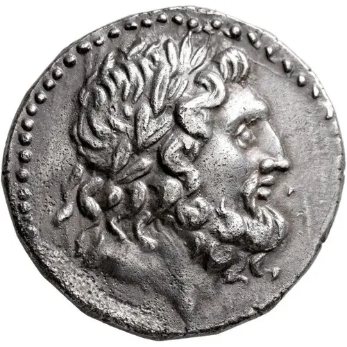 | Reverse description | Eagle, wings closed, standing left; to left, winged caduceus; all within maeander pattern. |