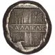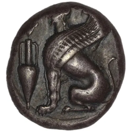 Sphinx seated left, to the left, a grape bunch above an amphora and all on shallow convex surface. |