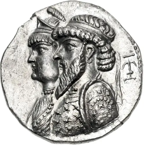 | Ön yüz açıklaması | Conjoined busts left of Kamnaskires and Queen Anzaze; anchor symbol behind. |