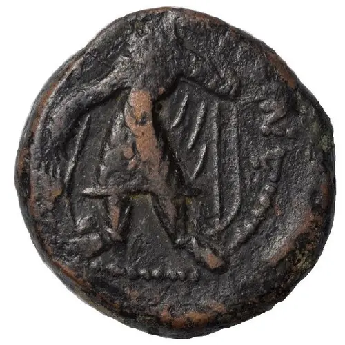 | Obverse description | King standing left beside altar, holding trident. Bactrian legend. |