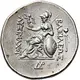 Reverse description Athena seated to left on throne, leaning her left elbow on her shield and holding Nike, crowning the king’s name, in her right; behind, transverse spear with point below left; in outer right field, thyrsos; in exergue, monogram of ΔΡ.
