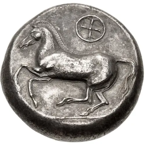 | Mô tả mặt trước | Horse prancing left; wheel with four spokes above. |
