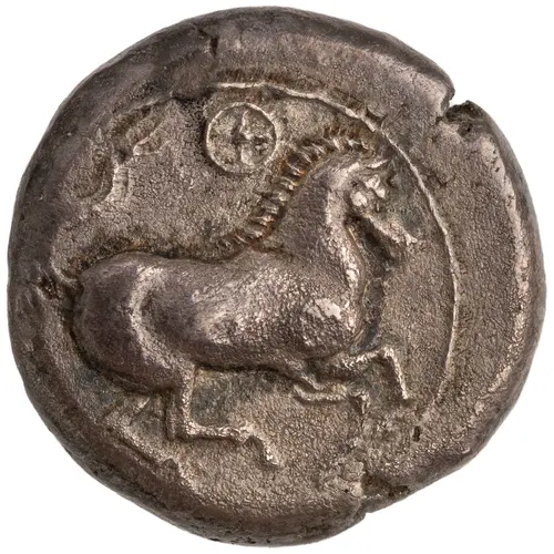 | توضیحات روی سکه | Horse galloping right; wheel above. |