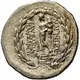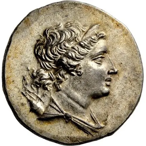| Reverse description | Apollo standing left on maeander pattern, holding filleted laurel branch with his right hand and leaning his left elbow on a tripod behind him and all within laurel wreath |
