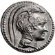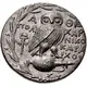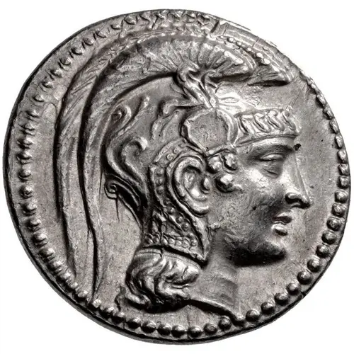 Opis awersu Head of Athena Parthenos right, wearing single-pendant earring and triple crested Attic helmet decorated with Pegasos and floral pattern.