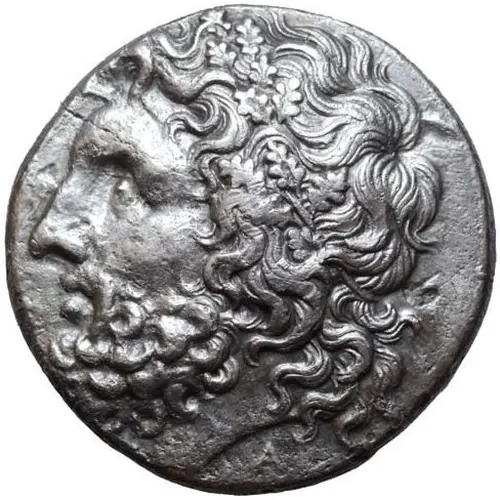 | Descripción del anverso | Head of Zeus Naios of Dodona left, wearing oak-wreath; below neck truncation, A. |