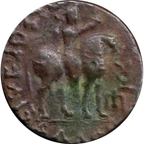 | Obverse description | King, holding whip, mounted on horse walking right. Gondopharan symbol in front |