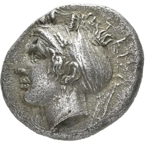 | Obverse description | Head of Kore Soteira left with her hair tied up in a sakkos, ears of grain, and an earring. |