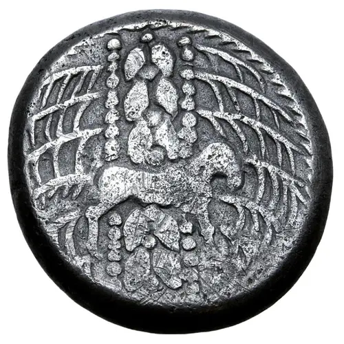 | Descrizione del dritto | Ram standing to right, superimposed on laurel wreath, from each side of which emanate fronds. |