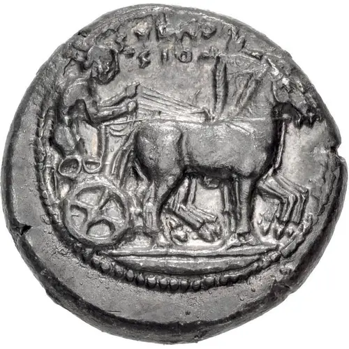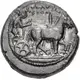 | Descrizione del dritto | Charioteer, holding reins in both hands, driving slow quadriga right; SVR (koppa)/SION in two lines above. |
