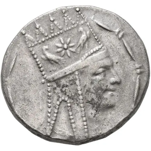 | Obverse description | Bust of Tigranes II right, draped, wearing tiara with five peaks sometimes with beads, decorated with a star between two eagles and tied with a diadem. Bead and reel border. |