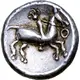 توضیحات پشت سکه Rider with spiked hair on horseback to right; annulet before.