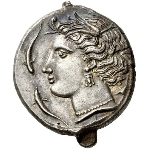 Obverse description Head of Tanit to left, wearing wreath of grain leaves, triple-pendant earring and pearl necklace. Around four dolphins