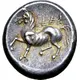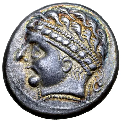 | Obverse description | Male (`Apollo`) head wearing three-strand pearl diadem to left. |