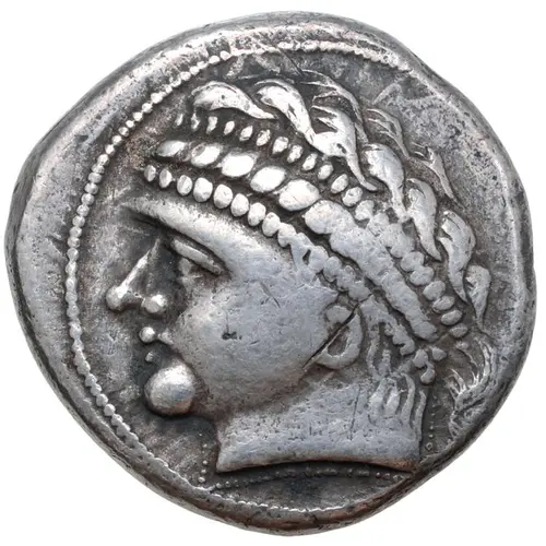 | Obverse description | Male (`Apollo`) head wearing three-strand pearl diadem to left. |