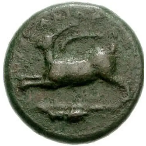 | Obverse description | Hare springing left; lagobolon above, locust on exergue line below |