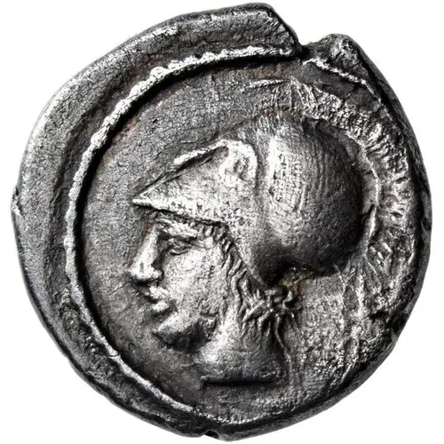 Obverse description Head of Aineias to left, with a light beard and wearing a crested Corinthian helmet.