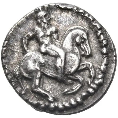 | Obverse description | Nude horseman riding a galloping horse to right, holding his left hand behind the horse`s neck and holding his right on the left side of his horse`s rump; border of dots. |