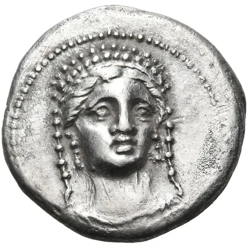 | Opis awersu | Lightly draped bust of Hera facing, turned very slightly to the right, wearing a diadem of pearls, with its ends hanging down on either side of her head, and triple-pendant earrings. |