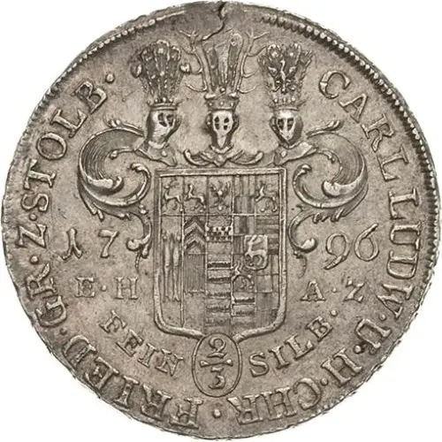 Historical Context: Issued in 1796 by the County of Stolberg-Stolberg, this ⅔ Thaler features co-rulers Charles Louis and Henry Christian Frederick. This coin reflects a period of shared governance within this small principality of the Holy Roman Empire. Struck amidst the French Revolutionary Wars, it underscores the continued assertion of sovereignty by minor German states. The ⅔ Thaler, equivalent to a Gulden, was a common circulating medium, facilitating local commerce and regional trade.