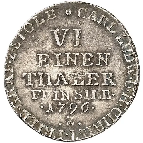 | 正面铭文 | CARL. LUDW. U. H. CHRIST. FRIED. GRAF. Z. STOLB. VI/EINEN/THALER/FEIN SILB. 1796 Z |