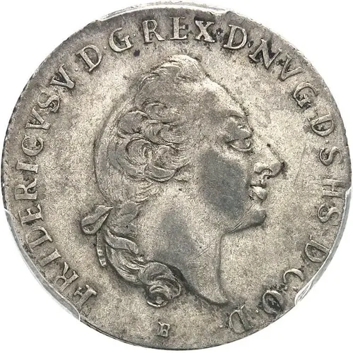 FRIDERICVS V D G REX D N V G D S H S D C O D B (Translation: Frederick V, by God`s grace King of Denmark and Norway, Duke of Schleswig-Holstein, Count of Oldenburg and Delmenhorst Johann Ephraim Bauert) |