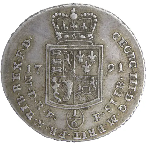 GEORG·III·D·G·M·BRIT·FR·&·HIB·REX·F·D 1791 N·D·R·F 1/6 F·SILB· (Translation: Georgius III Dei Gratia Magnae Britaniae Franciae et Hiberniae Rex Fidei Defensor) |