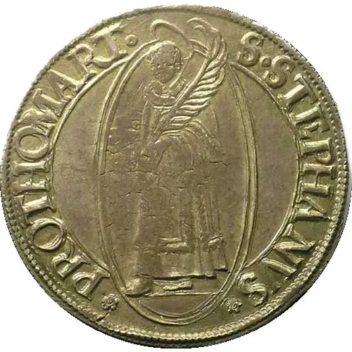| Opis awersu | Full-length standing figure of St. Stephen holding palm branch in elongated oval. |
