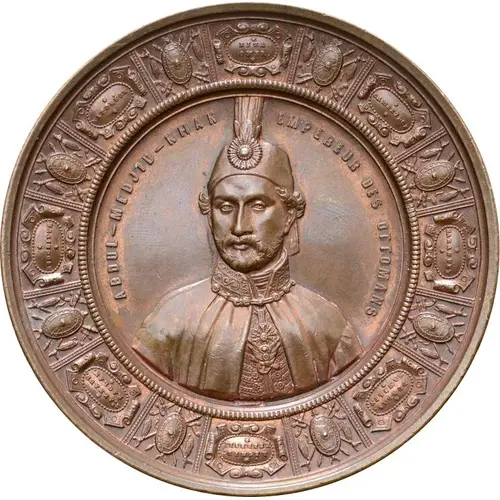 Bust of the Sultan Abdul Medjid facing slightly to left, eight cartouches with the names of the commanders and politicians of the Allied troops in the border. |