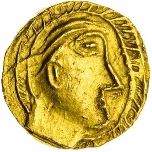 | Obverse description | Crude bust right, with large features and hair swept back, striated halo forms border. |